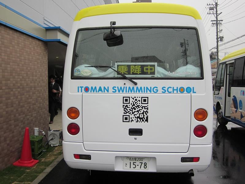 ↑ 後ろから見たスクールバス。QRコードが塗装されています。
