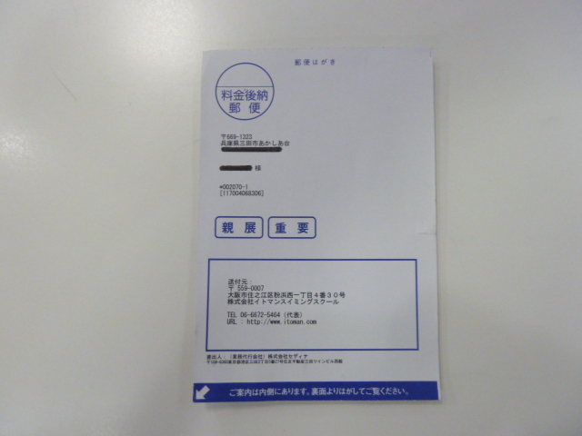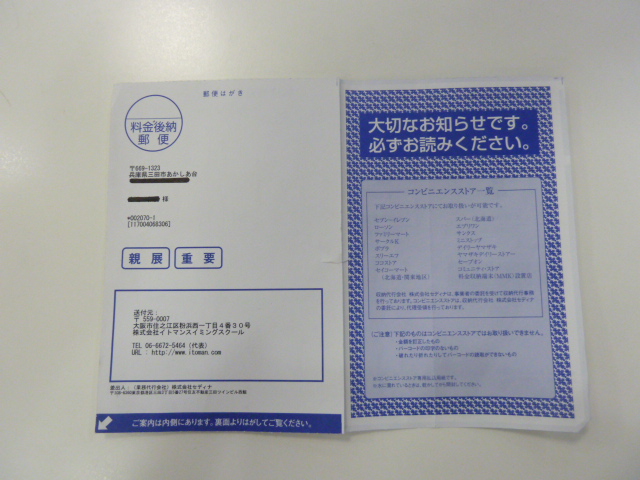 もちろん、「手数料を払うのはちょっと・・・・・・」という方はイトマン受付にハガキをご持参頂ければ店頭でお支払い頂けます。