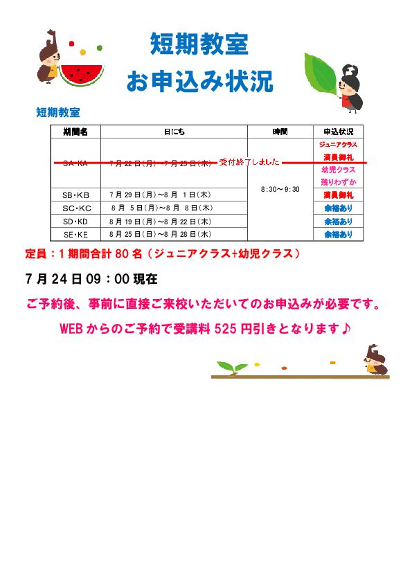 夏休み 短期教室お申し込み状況