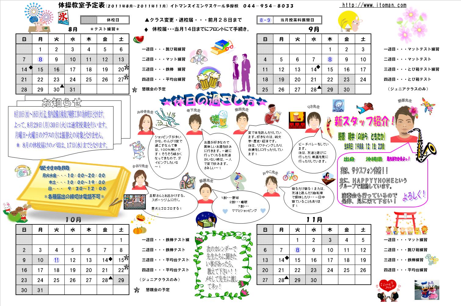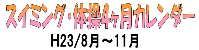※スイミングカレンダー・体操カレンダーともにクリックすると拡大されます。※カレンダーは新しいものがでる度、ホームページにてアップさせて頂いております。 是非ホームページ上でもご確認下さい。 随時カレンダーが確認できるのはコチラのページから
