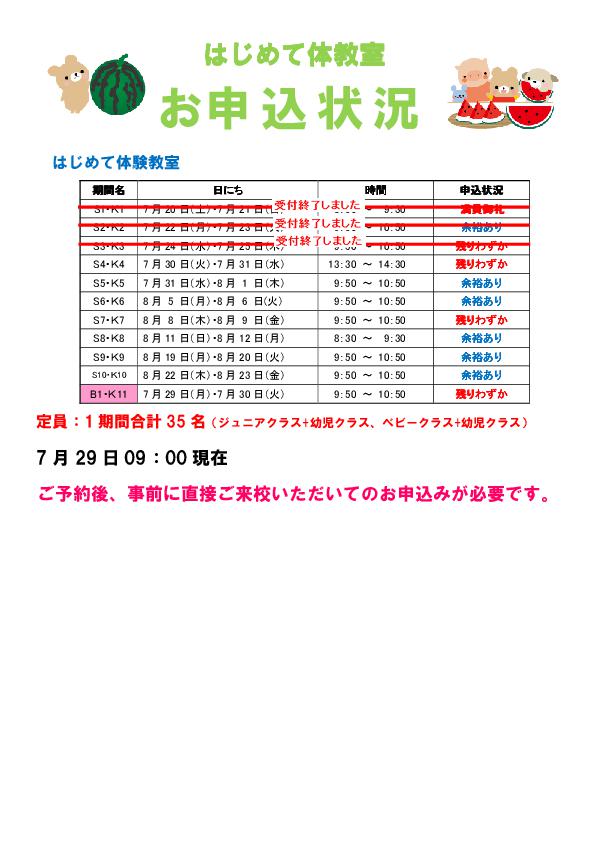 夏休み はじめて体験教室 お申込み状況