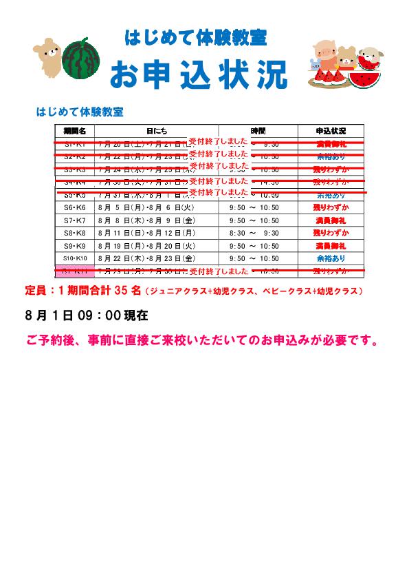 夏休み はじめて体験教室 お申込み状況