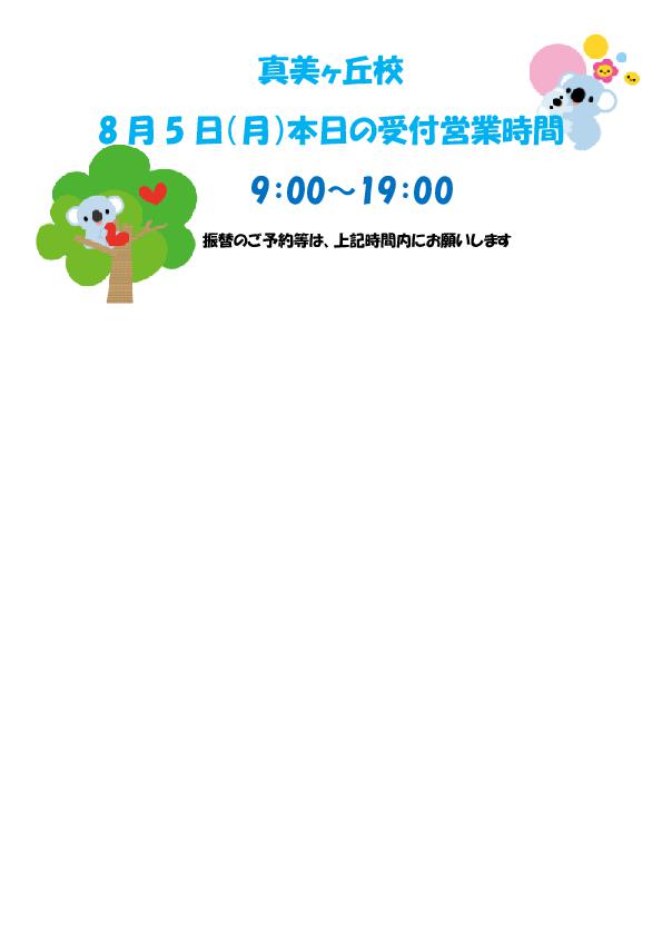 8/5 真美ヶ丘校 会員様へ本日の受付営業時間