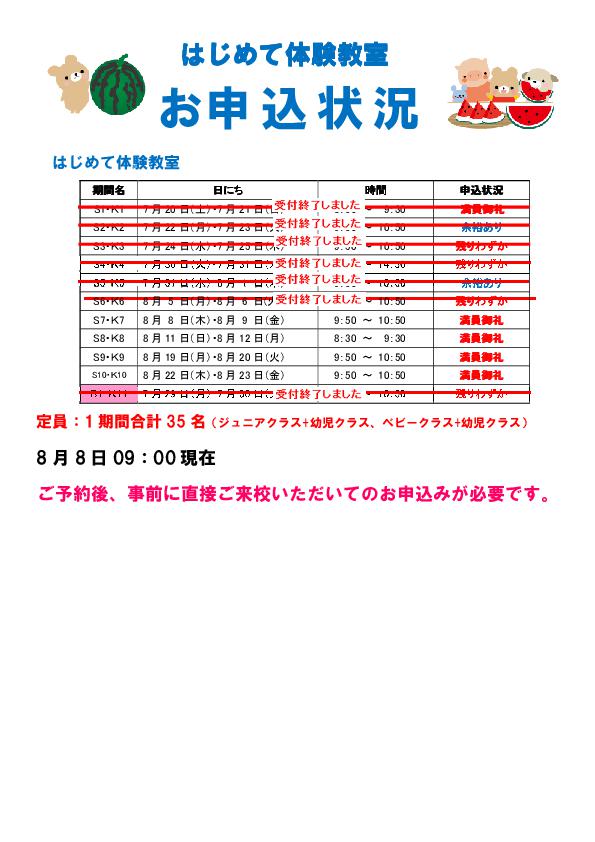 夏休み はじめて体験教室 お申込み状況
