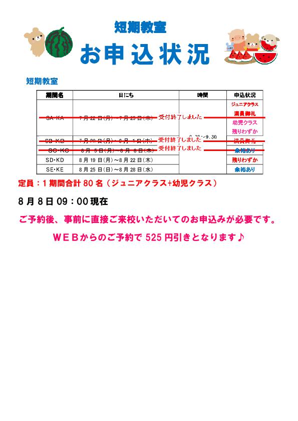 夏休み 短期教室 お申込み状況