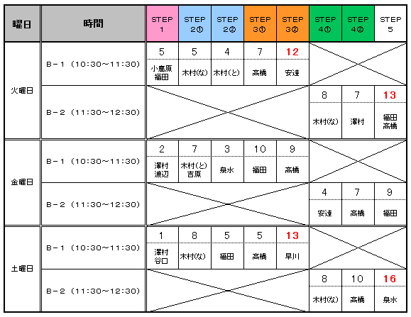 ※キャンセル待ちのクラスがあります!( 赤字のクラス )
