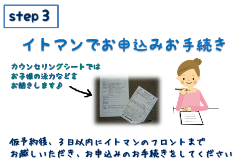 ご予約後、3日以内にご来校いただき、お手続きをお願いいたします。
