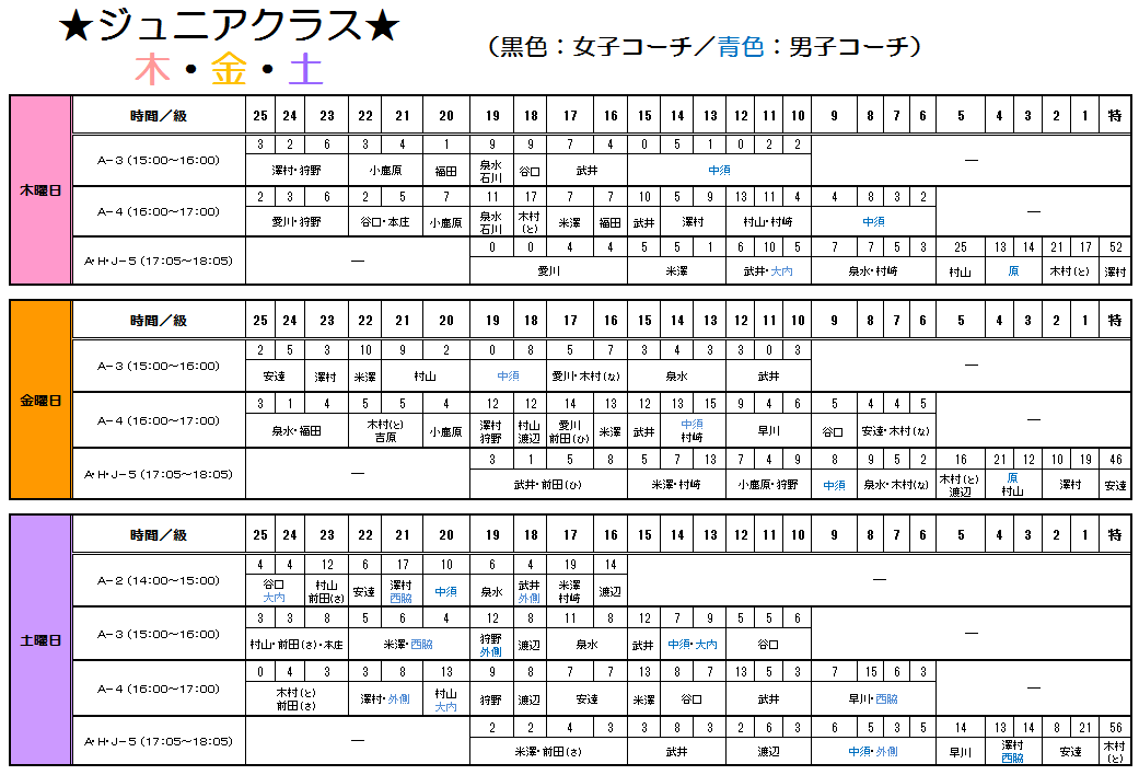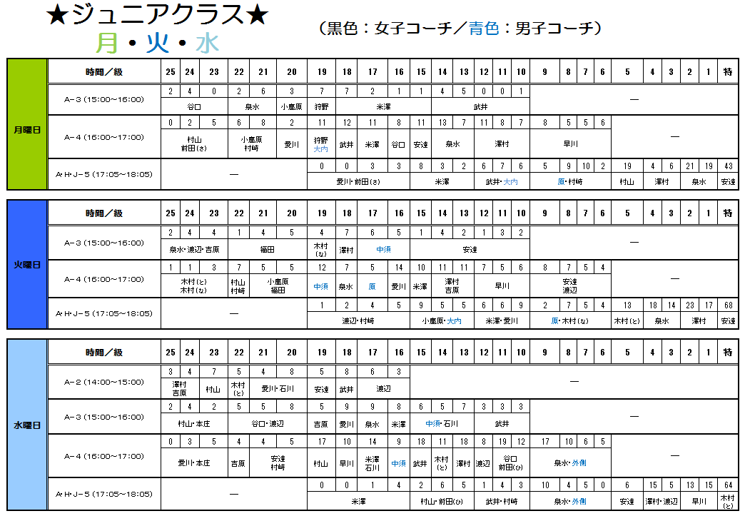 2月 ジュニアクラス在籍人数&担当コーチ表