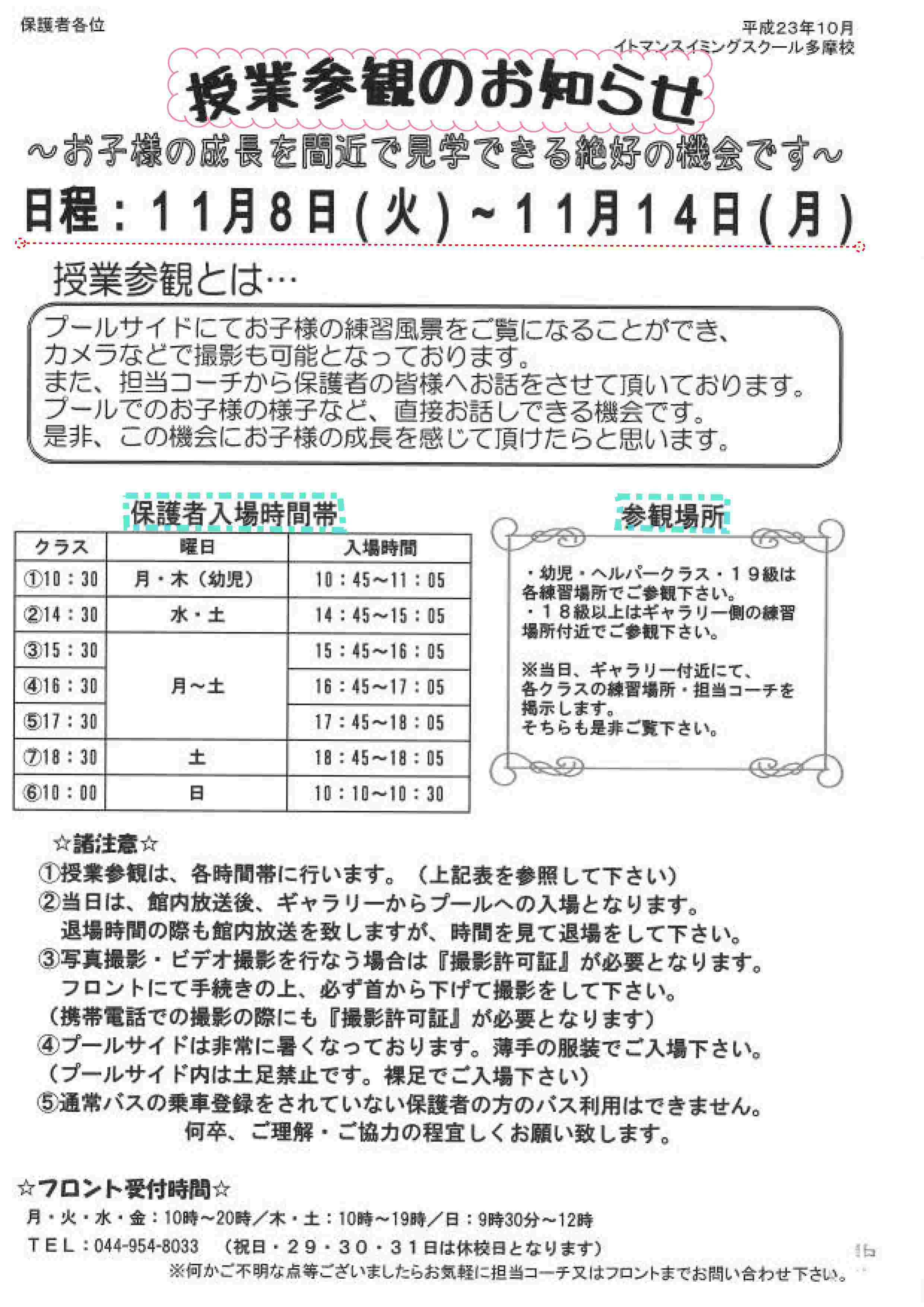 例年授業参観は大盛り上がりです!!普段、見られないお子様の水泳風景を是非間近で見られるチャンス!!※ベビークラスは対象外となりますのでご注意下さい