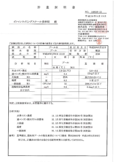 本校では、プールの水質管理を厳重に行っており、月に一度外部の検査会社に依頼し水質検査を行っております。