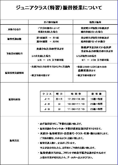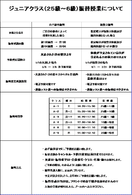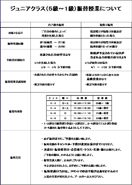 ジュニアクラス振替授業について ※画像をクリックするとPDFが開きジュニアクラス各級ごとの 振替授業方法をご覧いただけます。※振替授業のご予約は、前営業日までとなりますのでご注意下さい。◆ジュニアクラス 25級〜6級◆ジュニアクラス 5級〜1級