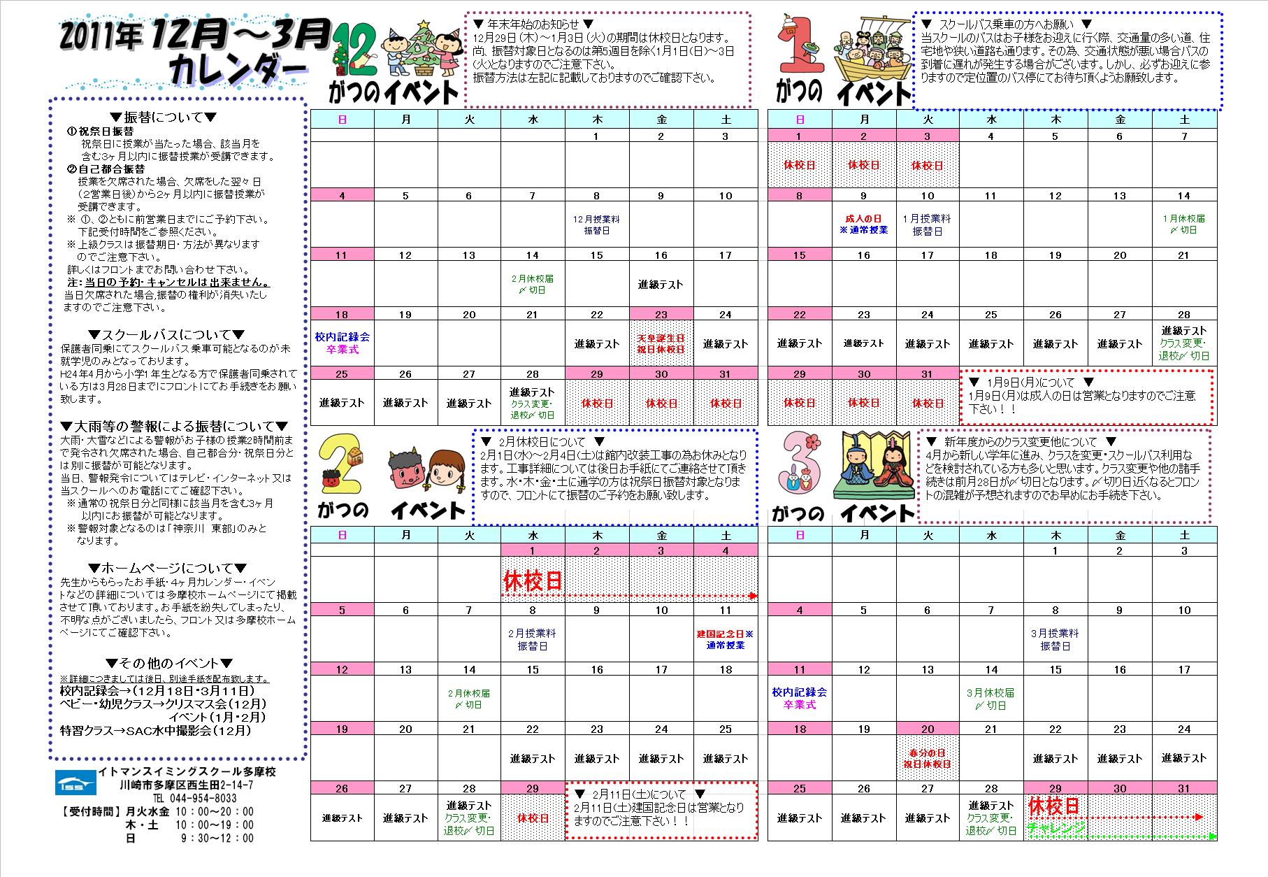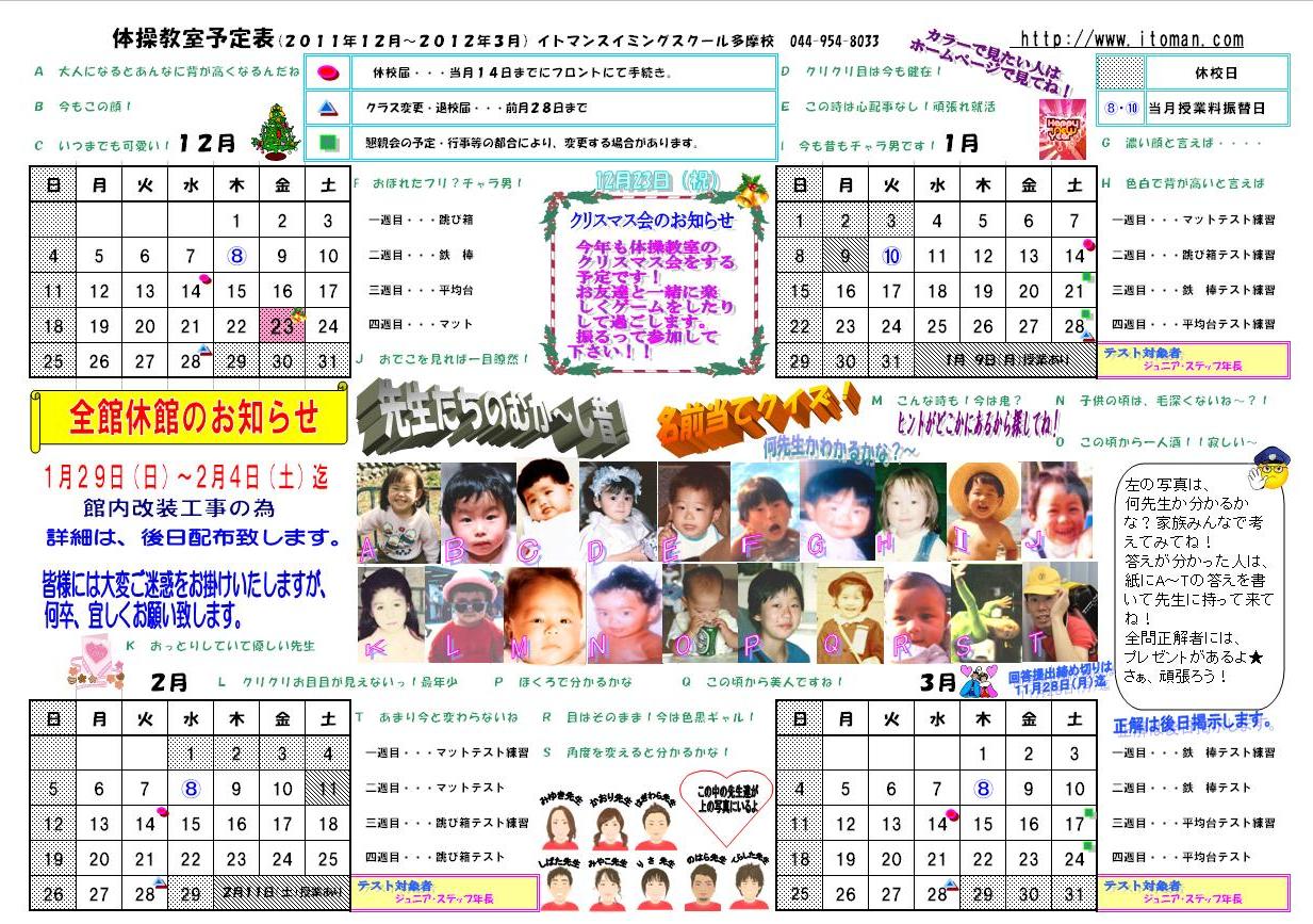 11月1日(火)より4ヶ月カレンダー(H23年12月〜H24年1月分)をお子様のカードケースへ入れております。ご自宅にてご確認下さい。スイミング用カレンダー (クリックすると拡大されます)