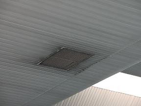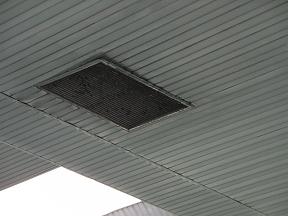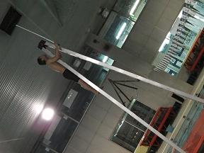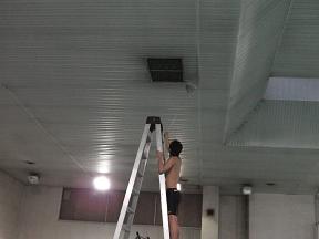 赤い台をつんだ上に長いはしごを置いて登り掃除する藤原先生