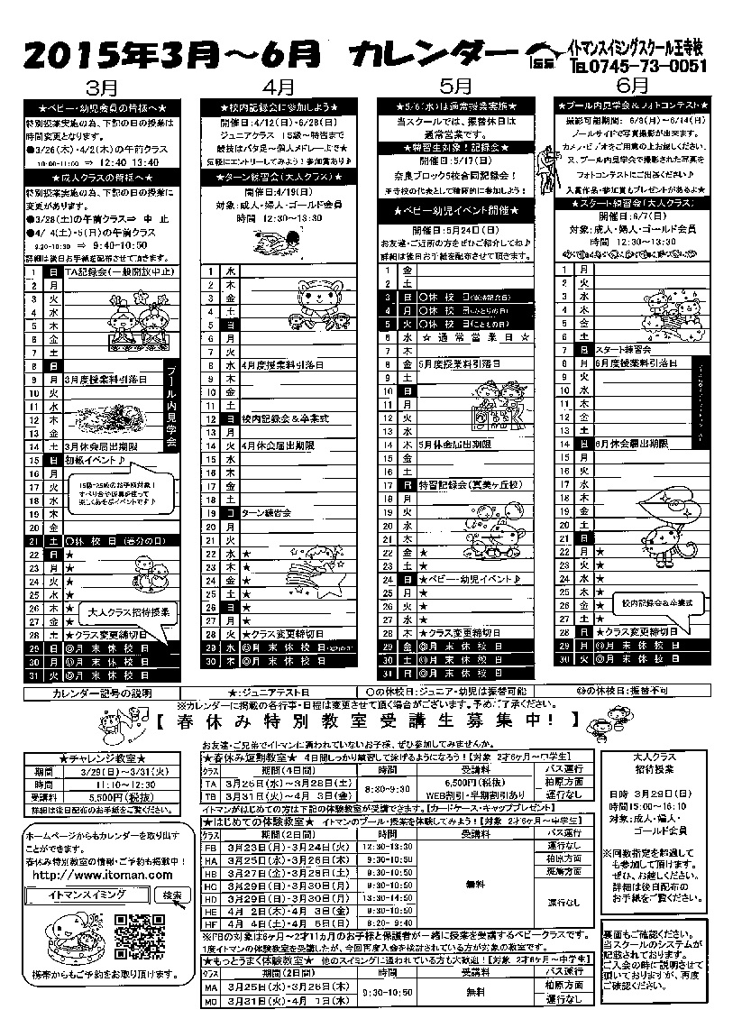 2015年3月~6月のカレンダーが完成しました!!2月15日(日)よりカードケースに入れております。ご確認ください!カレンダーは下のアイコンをクリックして頂いても確認が出来ます。