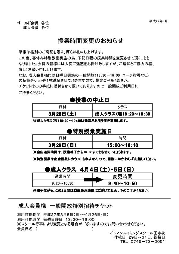 【ゴールド・成人会員様】授業時間変更のお知らせ