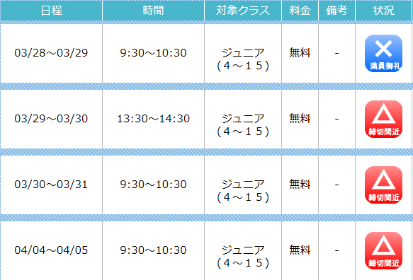 1〜2の基礎動作の習得に限られます。しかしながら、当社では短期教室用の設定級を設けており、