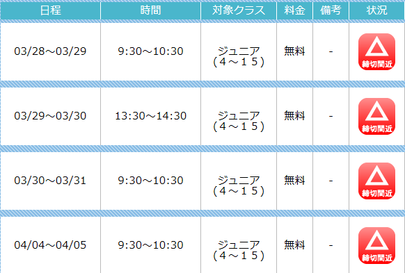 定員間近の期間もございますので、お申込みご希望の方はお早めにお申込みください