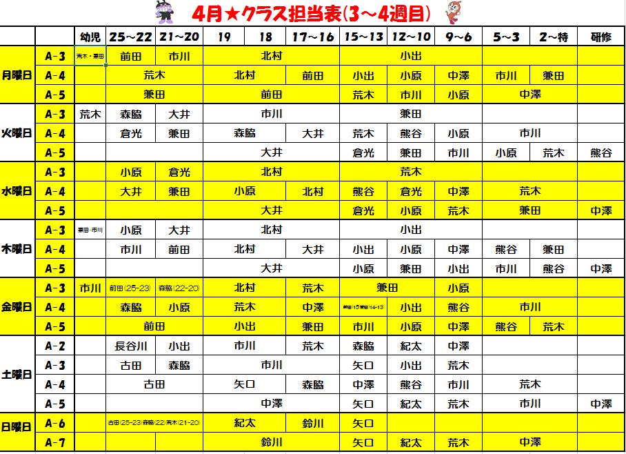 4月クラス担当表(3,4週目)