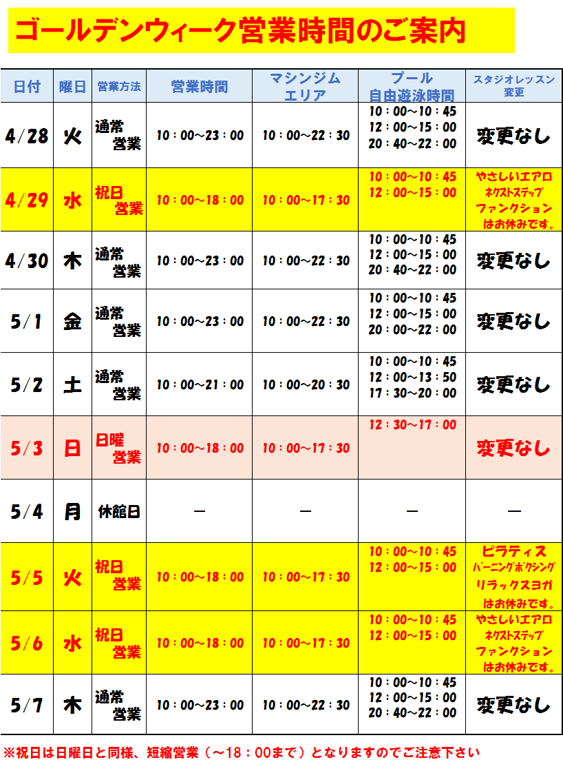 フィットネス ゴールデンウィーク営業のご案内を致します。