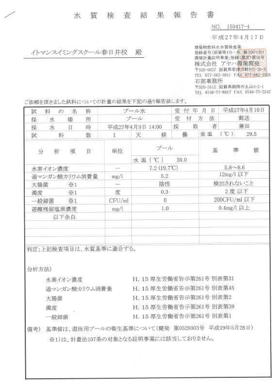 本校では、プールの水を月に一度、水質検査を厳重に行っております