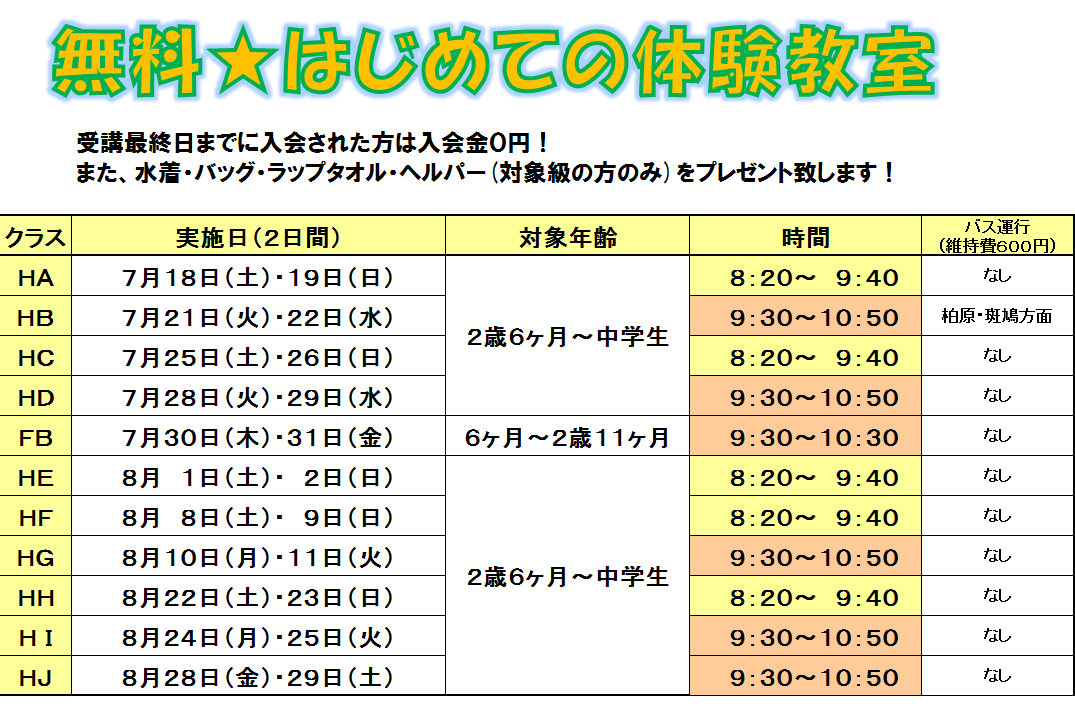 無料はじめての体験教室のタイムテーブルはこちらから♪