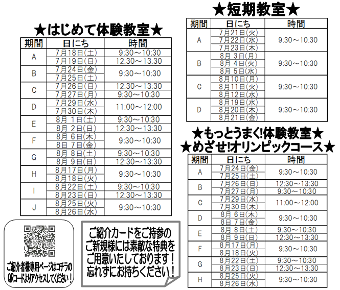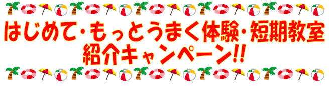 現在、受講者募集中の「夏休みはじめて・もっとうまく体験教室・めざせオリンピックコース・短期教室」に受講者をご紹介していただいた会員の方には・・・