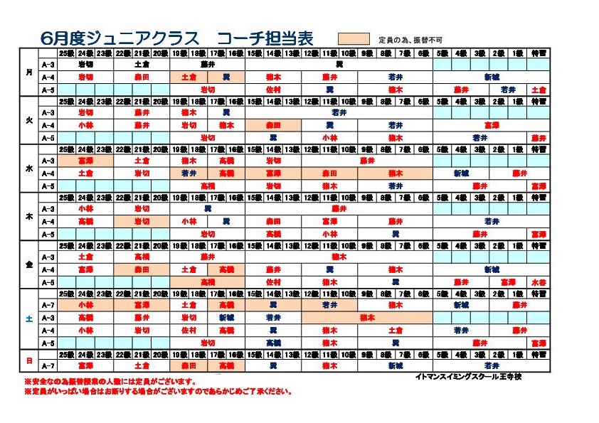 6月ジュニアクラスコーチ担当表