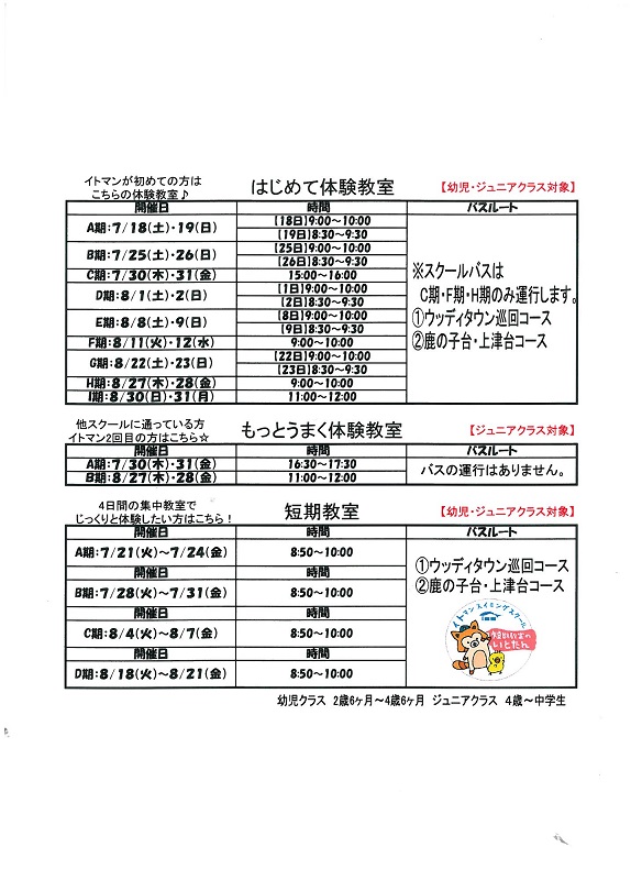 期間により運しない教室がございますので上記日程よりお確かめください。)