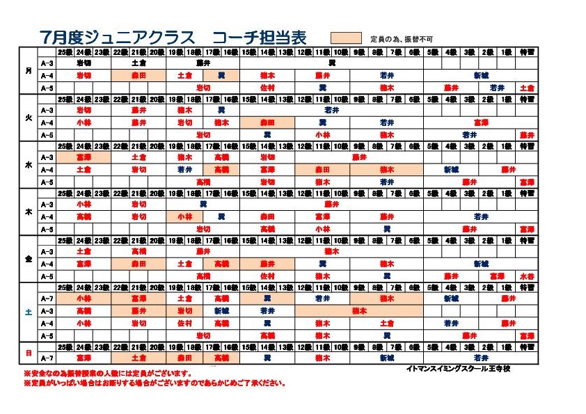 7月ジュニアクラスコーチ担当表