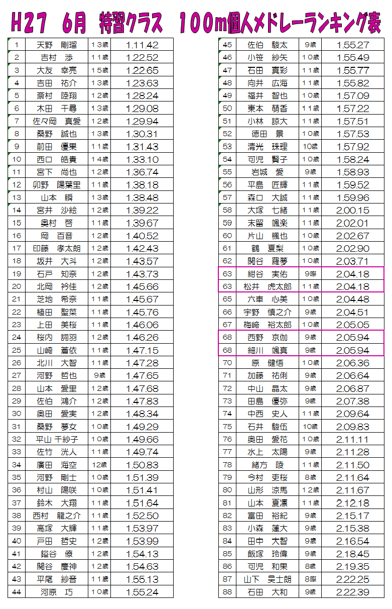 ◇100m個人メドレーのランキングはこちらです。