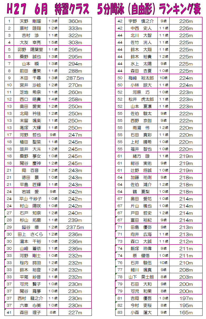 ◇5分間泳(自由形)のランキングはこちらです。
