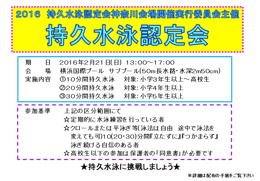 成人・婦人クラスの皆様へ〜持久水泳認定会のお知らせ〜