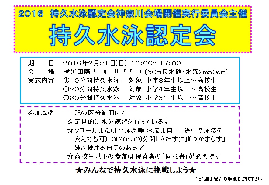 特習クラス・1級・2級の皆様へ〜持久水泳認定会のお知らせ〜