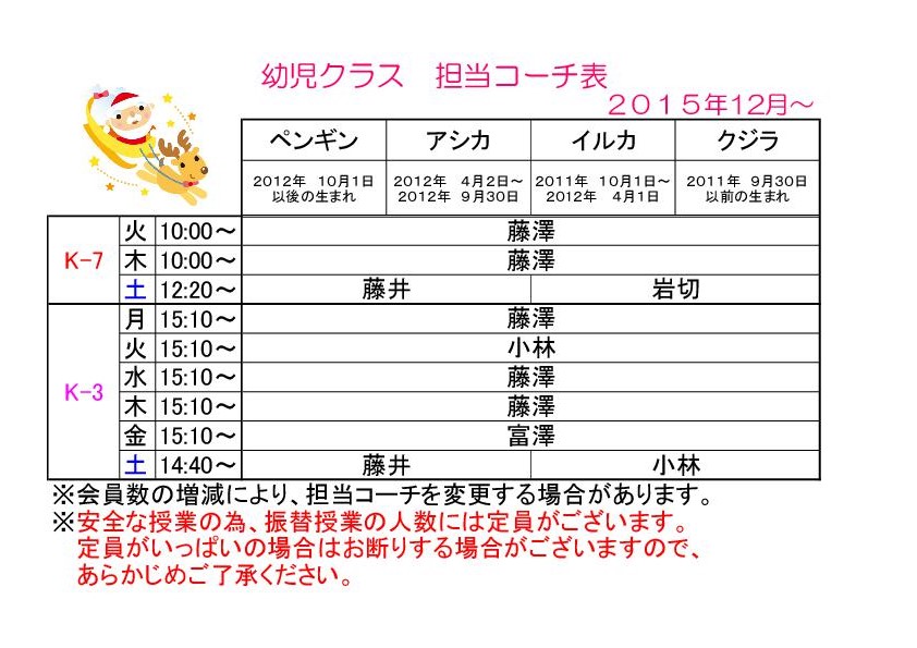 12月幼児クラスコーチ担当表☆