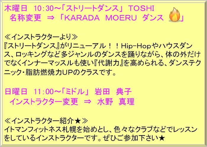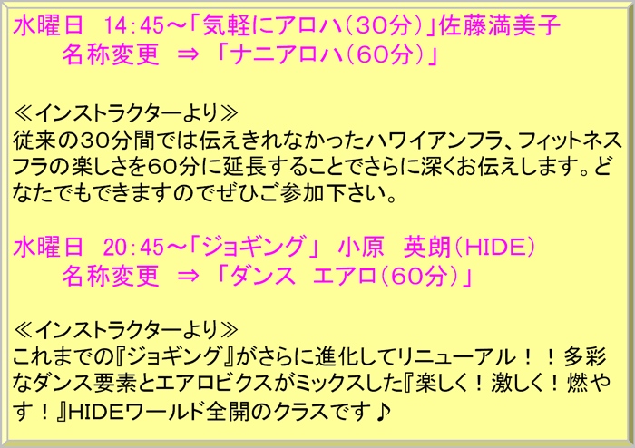 スタジオタイムテーブル変更のお知らせ【フィットネス】