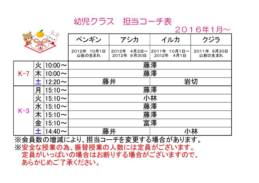 【幼児クラス】1月コーチ担当表