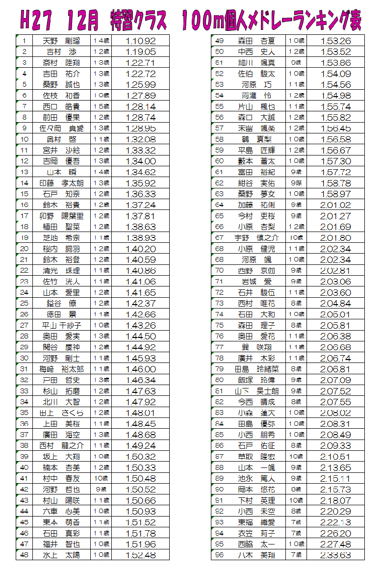12月16日(水)・22日〜28日は100m個人メドレーの記録を測りました