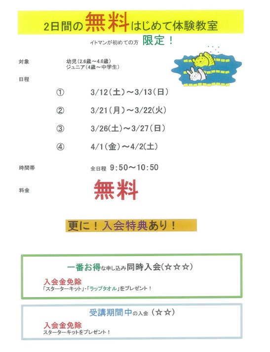 春の特別教室開催のお知らせその1 〜無料はじめて体験教室〜