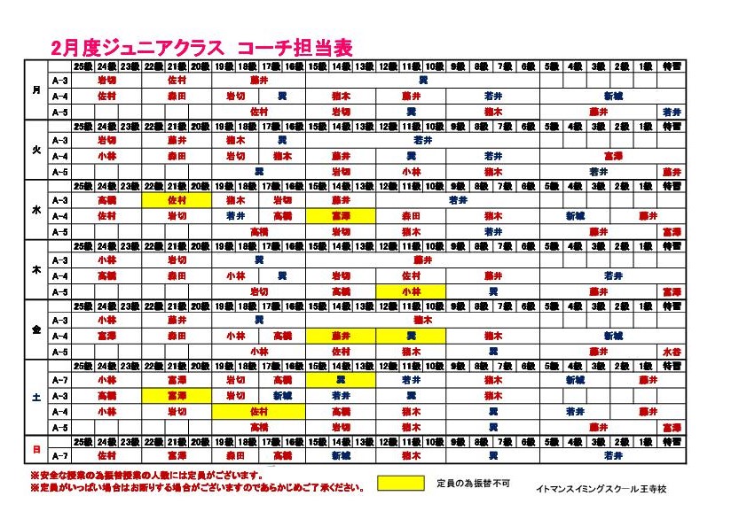 2月ジュニアクラスコーチ担当表