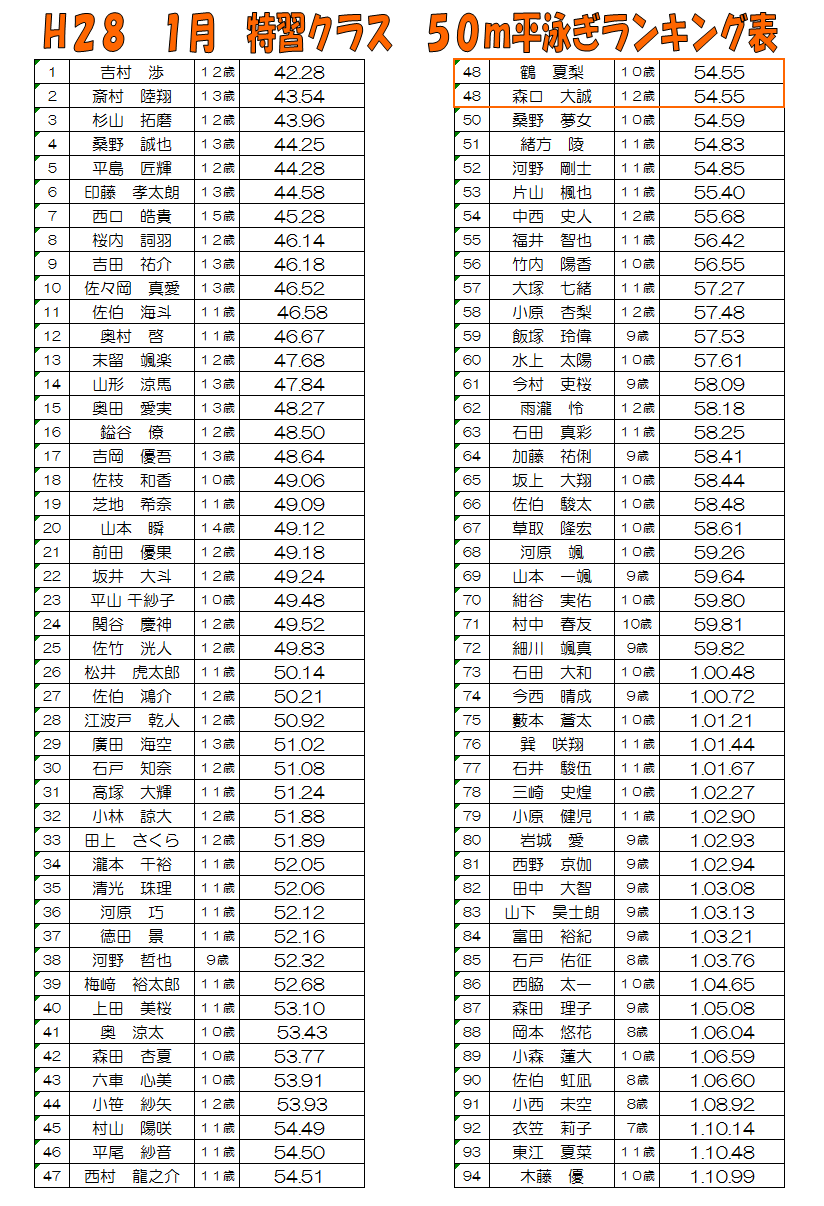 ★50m平泳ぎのランキングはこちらです。