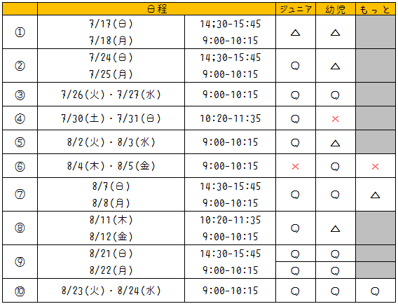2才半〜の幼児、4才〜のジュニア、あてはまる方でお申し込みください。