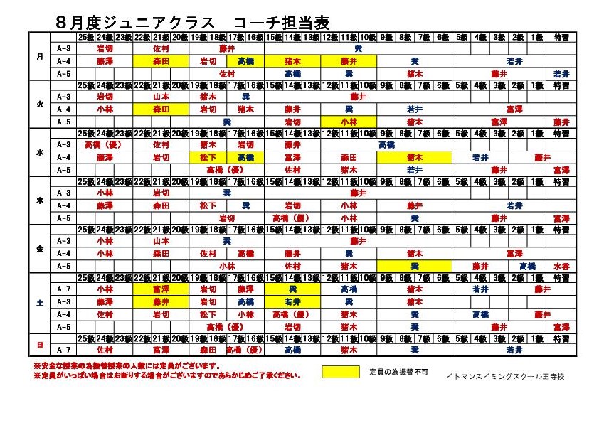 8月ジュニアクラスコーチ担当表