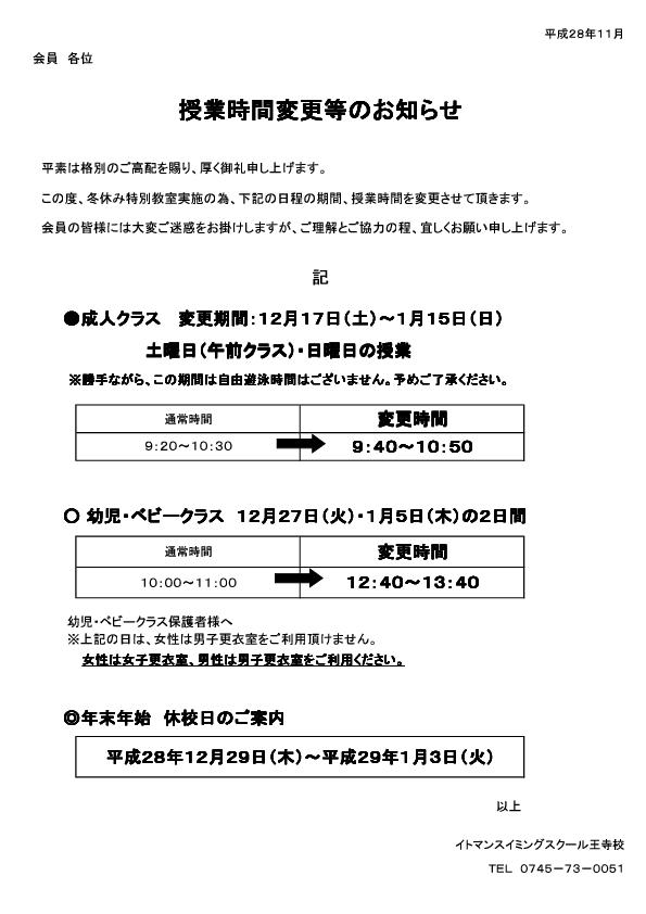 【成人クラス・ベビークラス・幼児クラスの受講生】授業時間変更のお知らせ