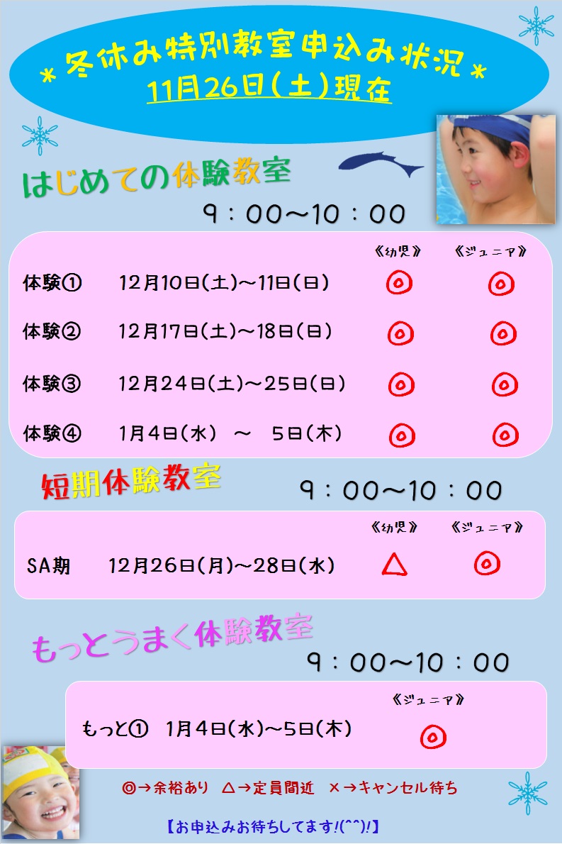 冬休み特別教室申込み状況【2016.11.26現在】