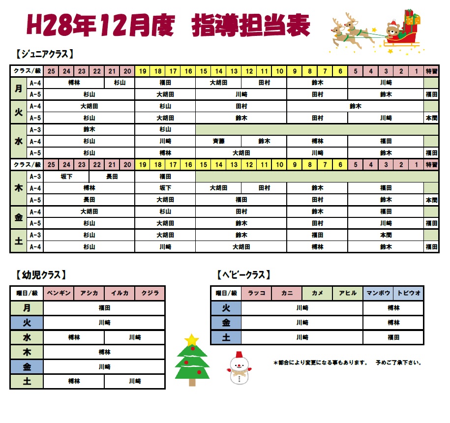 【 12月度 指導担当表 】