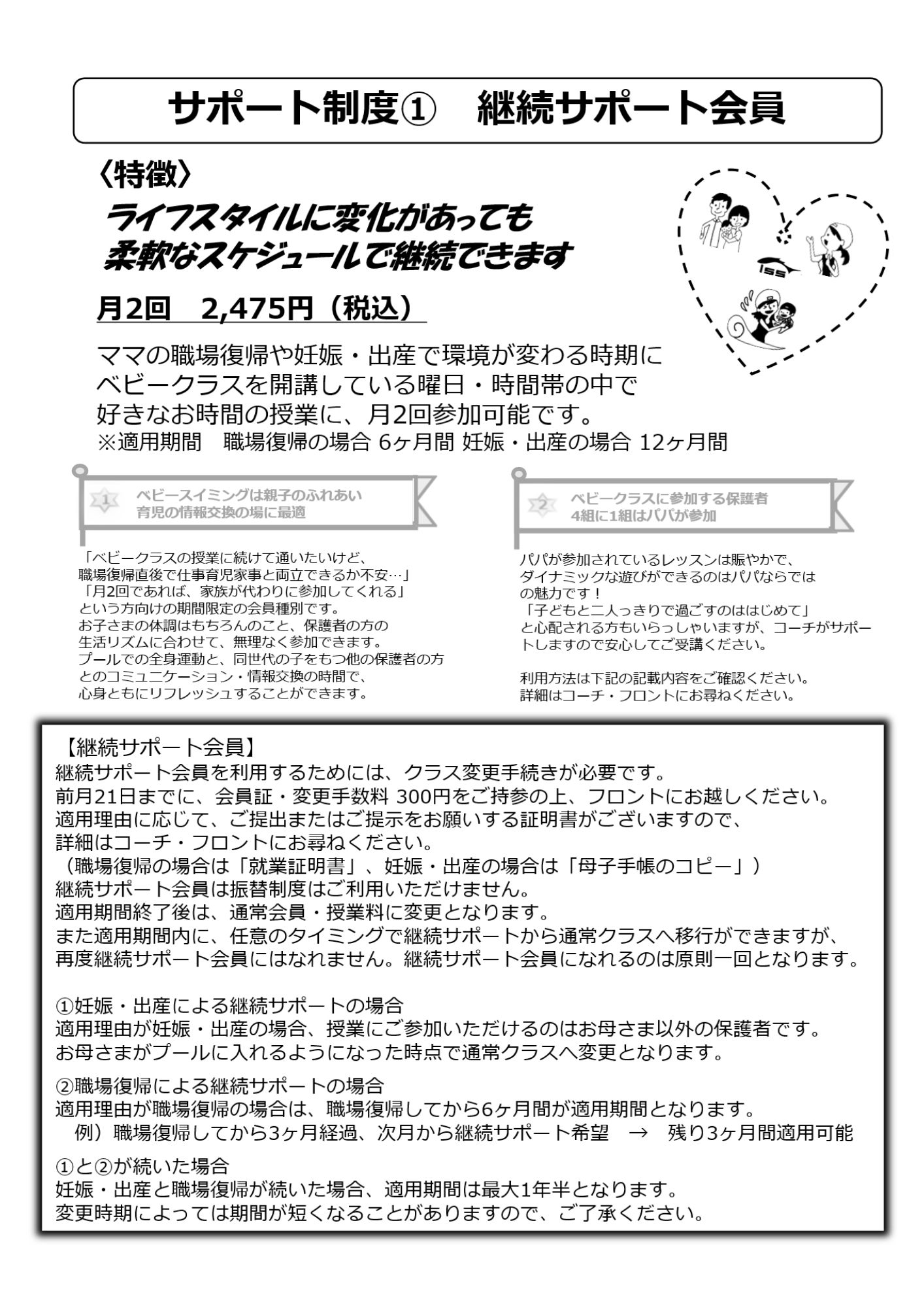 ベビークラスでは職場復帰や妊娠出産を迎えてもベビークラスを継続していただけるようにサポート制度を設けています。