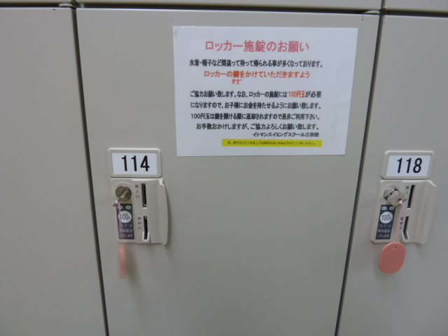 更衣室の中には100円ロッカー(カギを開ける際に100円は返却されます)がありますので