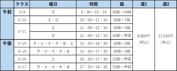 【曜日・時間・授業料】 ※下記時間内に、体操・授業・シャワー等が含まれます。