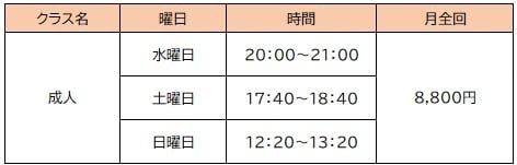 好きなお日にちにご受講いただけます。成人クラスの場合、上記曜日から毎週水曜日だけきても
