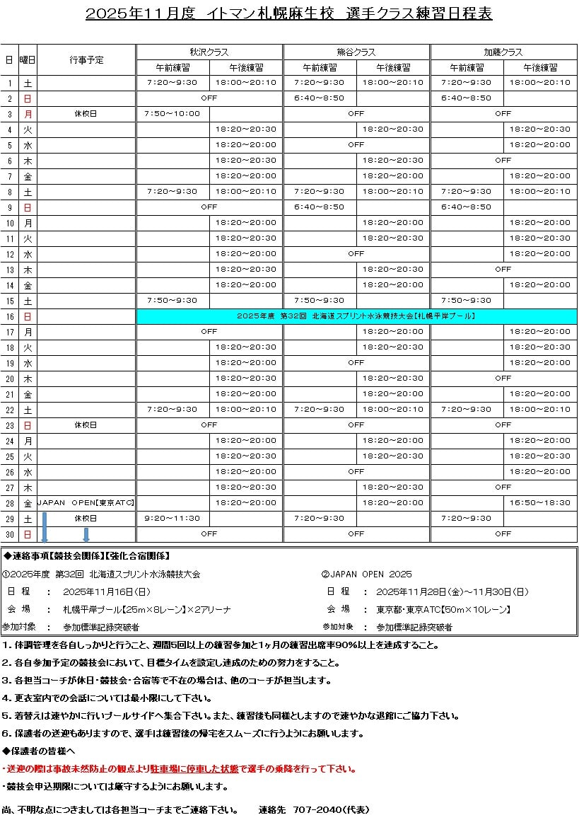 11月選手練習予定表